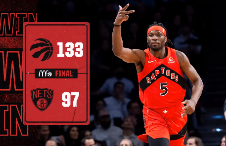 下半场易边再战,猛龙继续保持着20分以上的领先,末段时分差甚至被扩大至了31分,猛龙以100-69领先进入末节。末节开打,比赛进入垃圾时间,但猛龙火力不减,分差最大时达到了38分,最终猛龙以133-97大胜篮网。