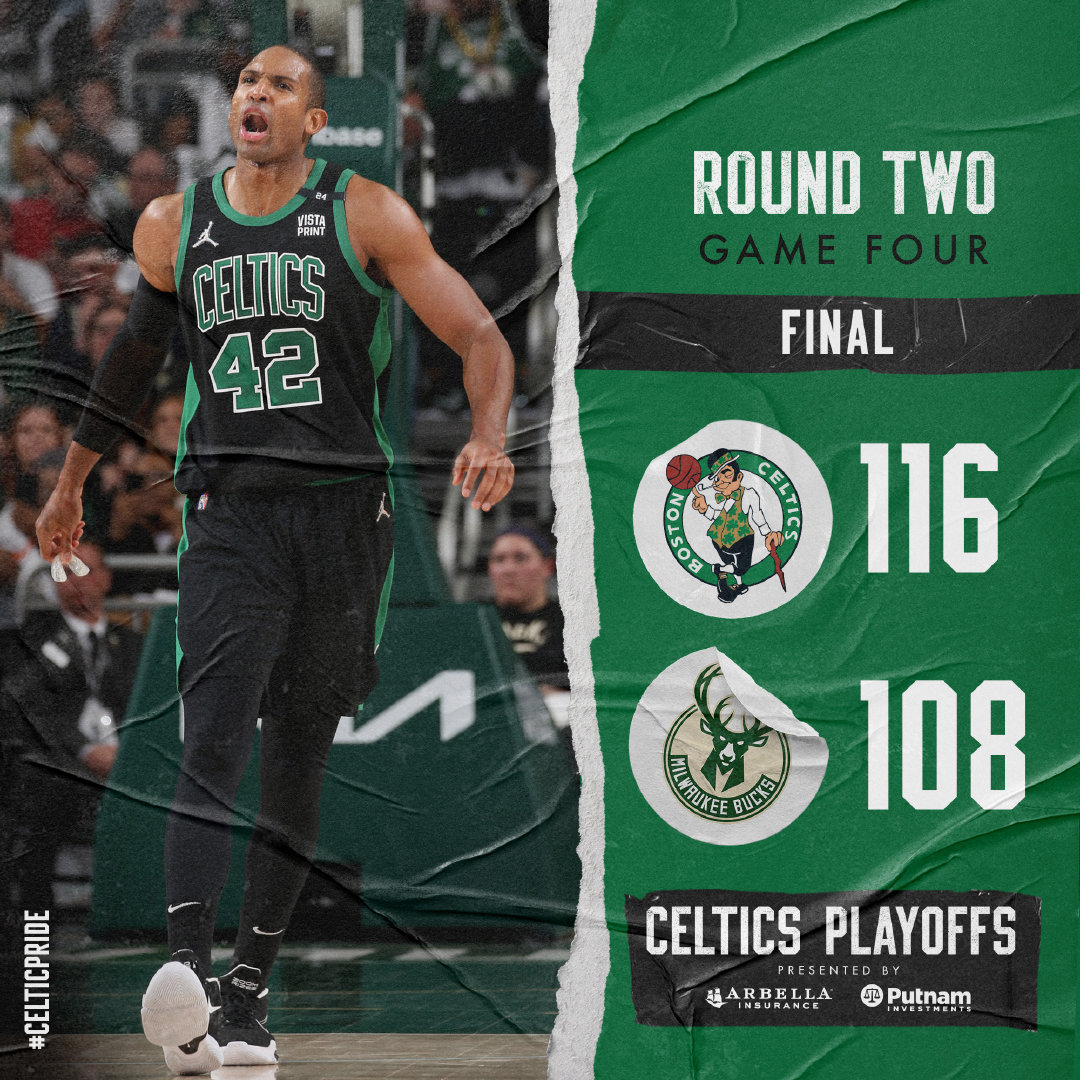 末节凯尔特人队8-1开局,81-81双方战平。 8分01秒霍福德三分命中,凯尔特人88-85反超3分。字母哥一度帮助雄鹿94-92重新领先,但随后霍福德和塔图姆发力联手打出一波14-2的攻击波,106-96分差拉开到10分,雄鹿请求暂停。暂停后阿伦和马修斯的三分将差距缩小到6分,斯玛特的抛投和布朗的两罚两中,让凯尔特人112-102重新领先10分。此后凯尔特人保持住了领先优势,116-108拿下比赛的胜利。