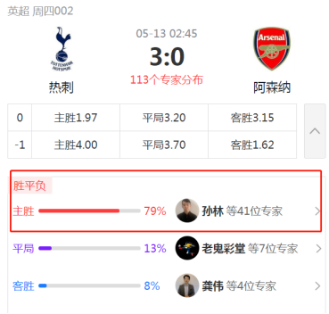 正如专家老师所说,从战意和近况,两队都还不错,但完全没有给到排名靠前的阿森纳太多支持,机构认为热刺坐镇主场优势不小。结合场面,确实阿森纳的后防并不稳健,早早就是被锁定胜局,其中还被罚下一人,导致天平完全偏向了热刺。