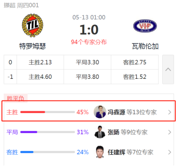 本场比赛红单数据,有45%偏向了主队,其中专家冯鑫源认为,从实力来看,不过是近期还是往绩,显然是瓦勒伦加占据优势,但如此优势,机构却给到了特罗姆瑟让步。显然机构已经偏向了弱旅,整体看好特罗姆瑟主场优势,本场我们不妨看好特罗姆瑟主场赢球。