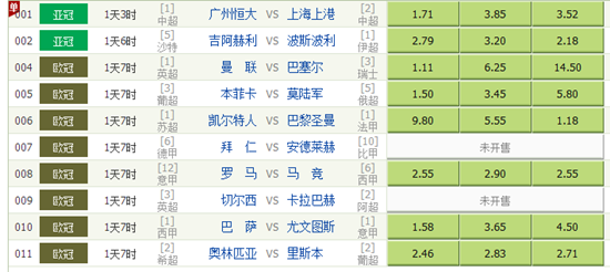 竞彩足球9月12日共有36场比赛受注,主要由欧冠、亚冠、英冠、英甲组成,另有几场杯赛也可投注。焦点赛事当然是亚冠的广州恒大VS上海上港,两队交战史上,恒大主场未有败绩,但是在足协杯和亚冠1/4决赛上,恒大都输给了上港,如今这场结果如何,让我们拭目以待吧。