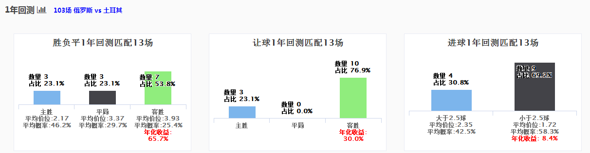 从Q系统早盘来看胜平负一年回测中反倒是客胜概率领先53.8%领先。在让球回测中客胜的概率高达76.9%。全场小于2.5球概率最高69.2%,从早盘的Q系统来看倾向于客胜。