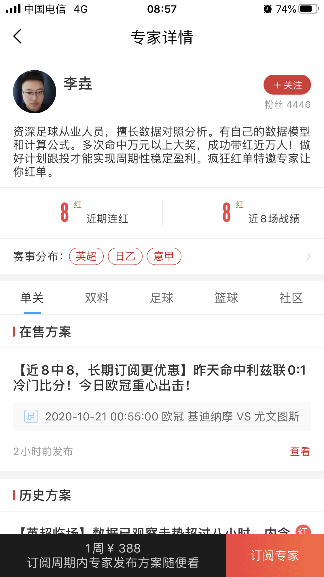 李垚(点击进入主页)资深足球从业人员,擅长数据对照分析。有自己的数据模型和计算公式。多次命中万元以上大奖,成功带红近万人!做好计划跟投才能实现周期性稳定盈利。疯狂红单特邀专家让你红单。今日精选欧冠赛事已经发车,看好跟单!