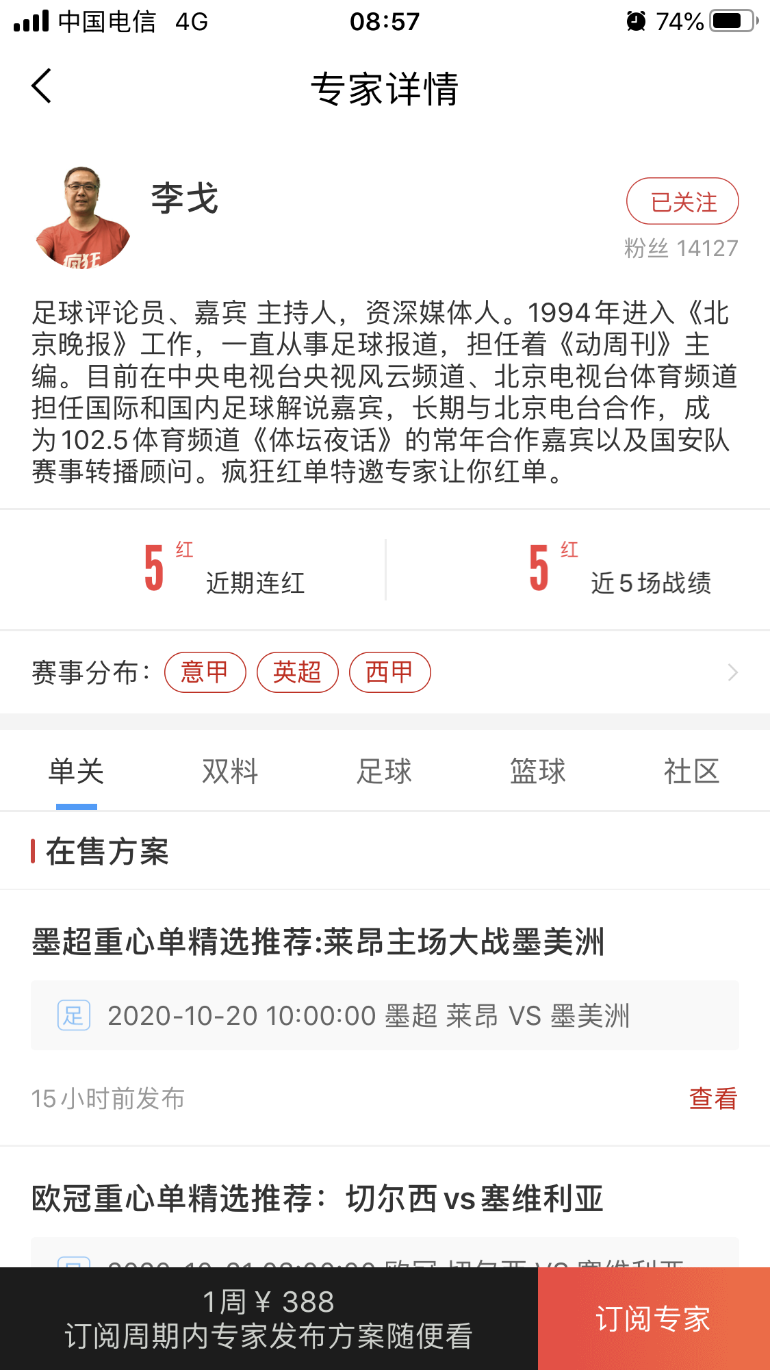 李戈(点击进入主页)足球评论员、嘉宾 主持人,资深媒体人。1994年进入《北京晚报》工作,一直从事足球报道,担任着《动周刊》主编。目前在中央电视台央视风云频道、北京电视台体育频道担任国际和国内足球解说嘉宾,长期与北京电台合作,成为102.5体育频道《体坛夜话》的常年合作嘉宾以及国安队赛事转播顾问。疯狂红单特邀专家让你红单。今日精选欧冠赛事已经看好,跟单就是赚!