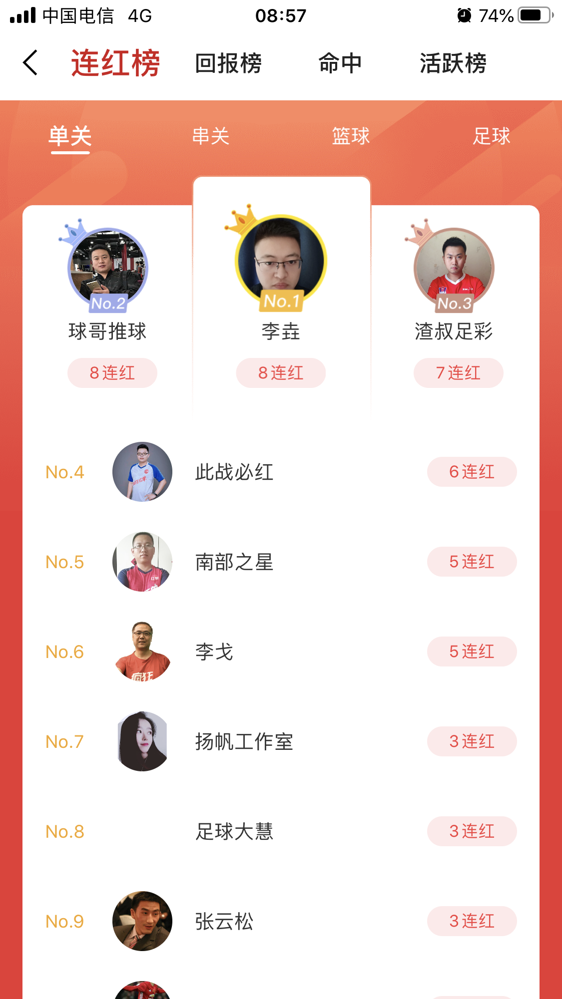 此外,今日多位专家收获长连红走势,球哥推球8连红,渣叔足彩7连红,此战必红6连红,南部之星5连红。众多专家在线送胆!跟上就是赚到!速来红单一起盈利!