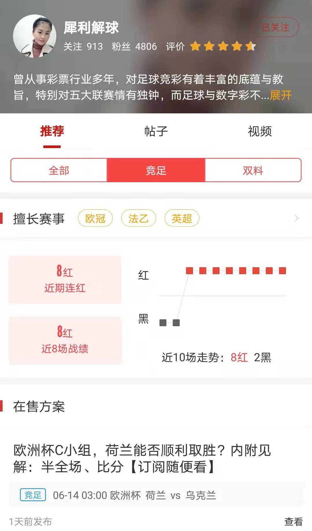 犀利解球(点击进入主页)曾从事彩票行业多年,对足球竞彩有着丰富的底蕴与教旨,特别对五大联赛情有独钟,而足球与数字彩不同,数字彩属于随机性,而足球是可以通过各数据,分析出不低于百分之九十,及以上的命中率的,期待各位彩友关注哟!