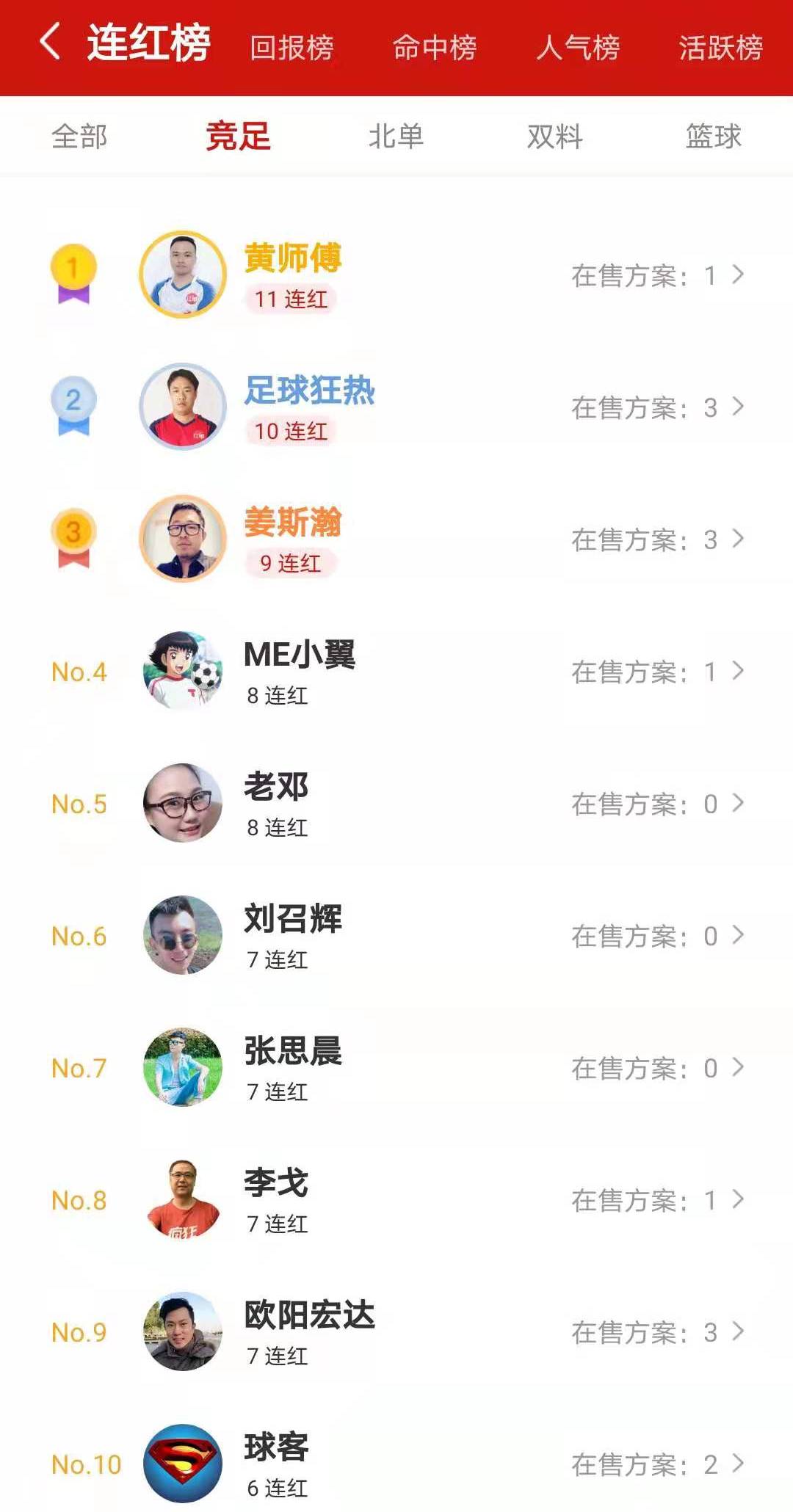 此外,昨日多位专家收获长连红走势,黄师傅11连红,足球狂热10连红,姜斯瀚9连红,ME小翼8连红,老邓8连红,刘召辉7连红,张思晨7连红,李戈7连红,欧阳宏达7连红!众多专家在线送胆!跟上就是赚到!速来红单一起盈利!