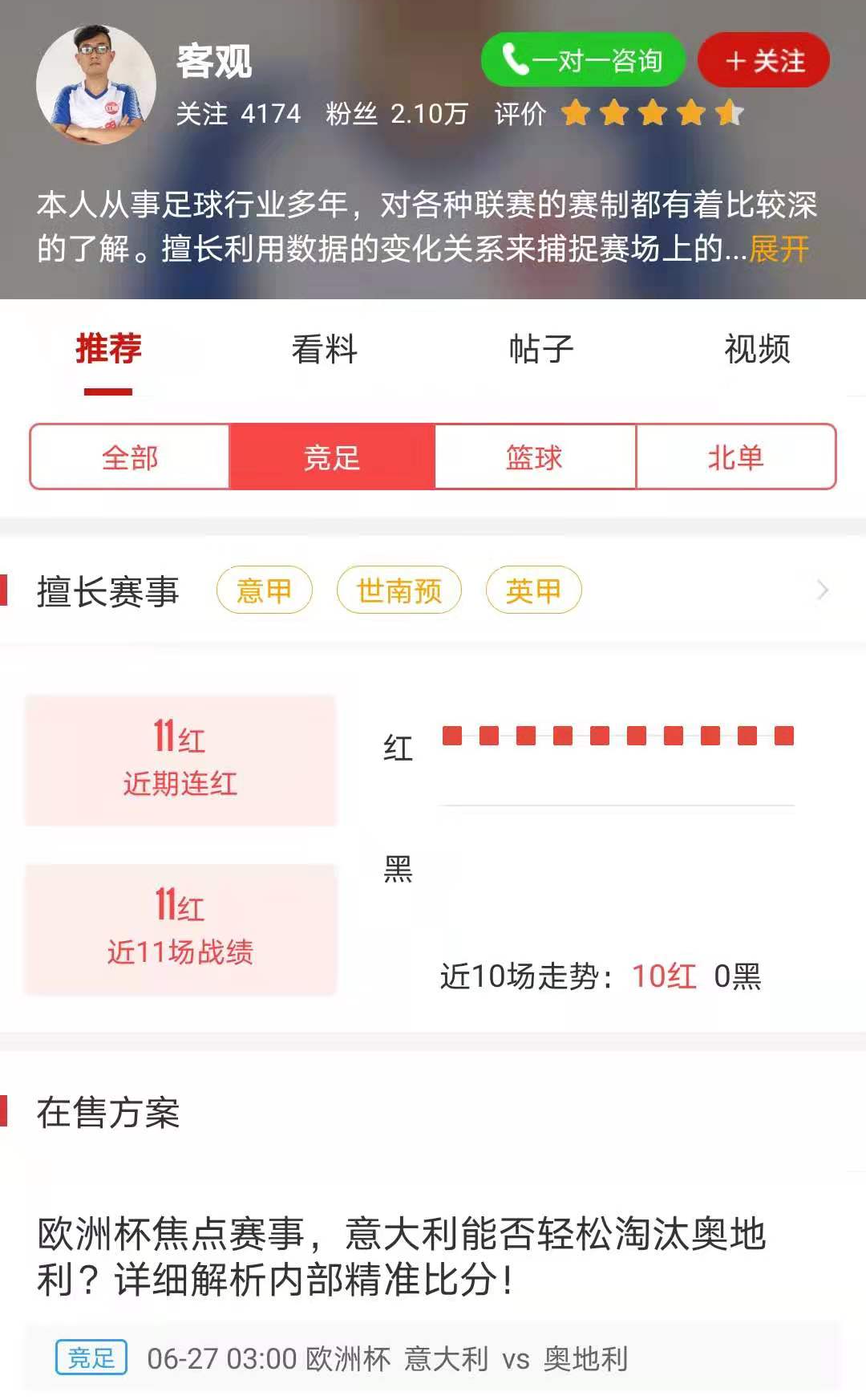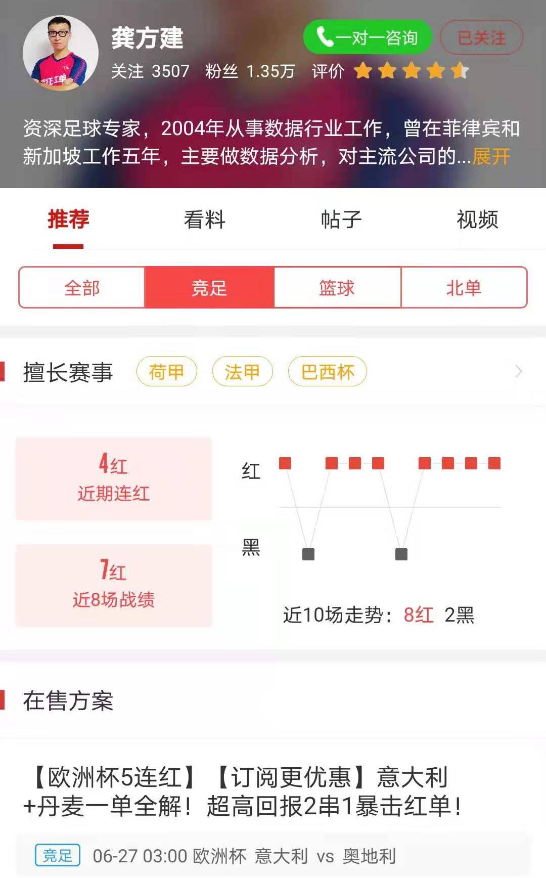 红单专家『龚方建』本周状态火热,近两天比赛场次一般,但依旧拿下了多场美职业和巴甲,收获四连红!还有专家『客观』以11连红,领跑连红榜,状态出色!下面让我们来看看红单大神们的出色表现。