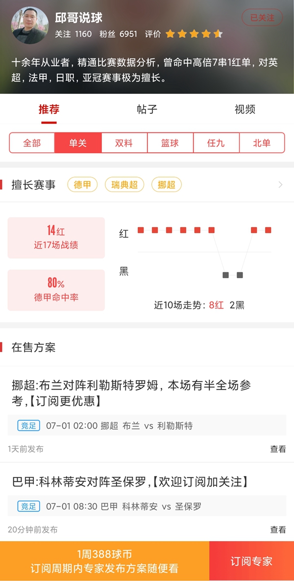 大家好,我是疯狂红单的特邀专家『邱哥说球』,目前我在平台拿到17中14的战绩,虽然没有实现17连红,但我在欧洲杯淘汰赛拿到8中7的战绩,其中命中意大利平局以及单挑0:0比分,荷兰输球单挑0:2比分,英格兰胜单挑2:0比分,乌克兰平局单挑1:1比分,丹麦大胜但比分未命中,法国平局比分未命中,比利时胜但比分未命中,最遗憾的是西班牙独赢遭绝平。