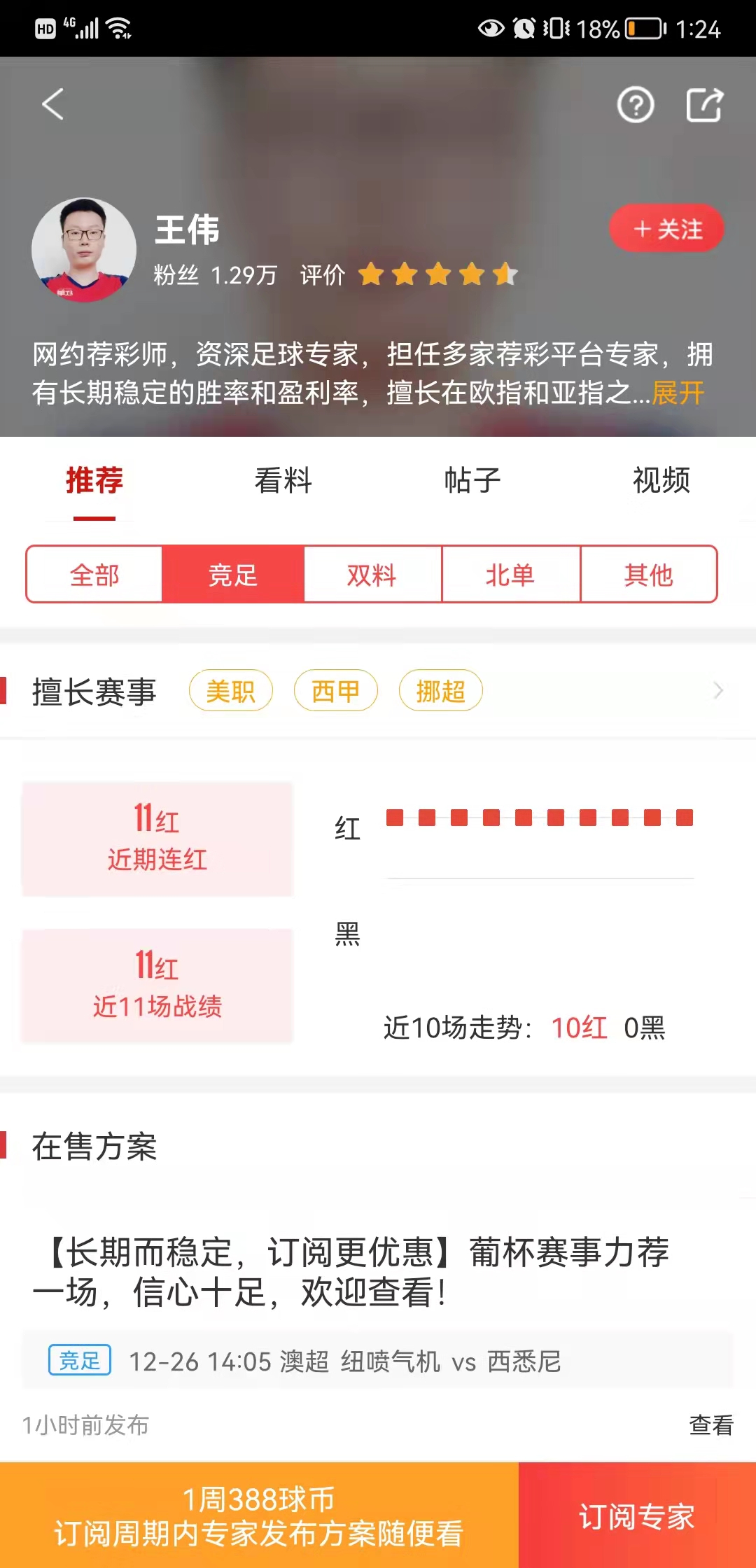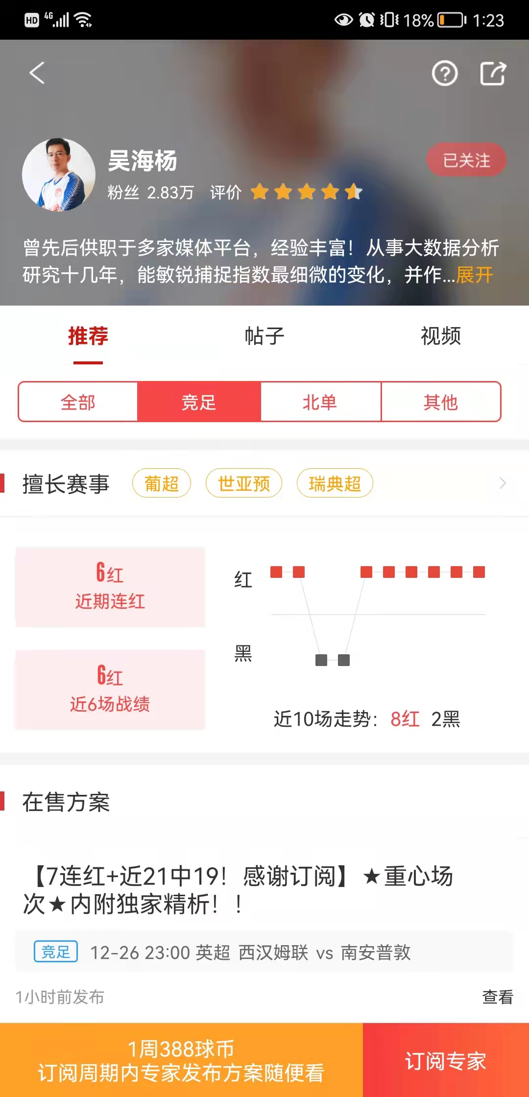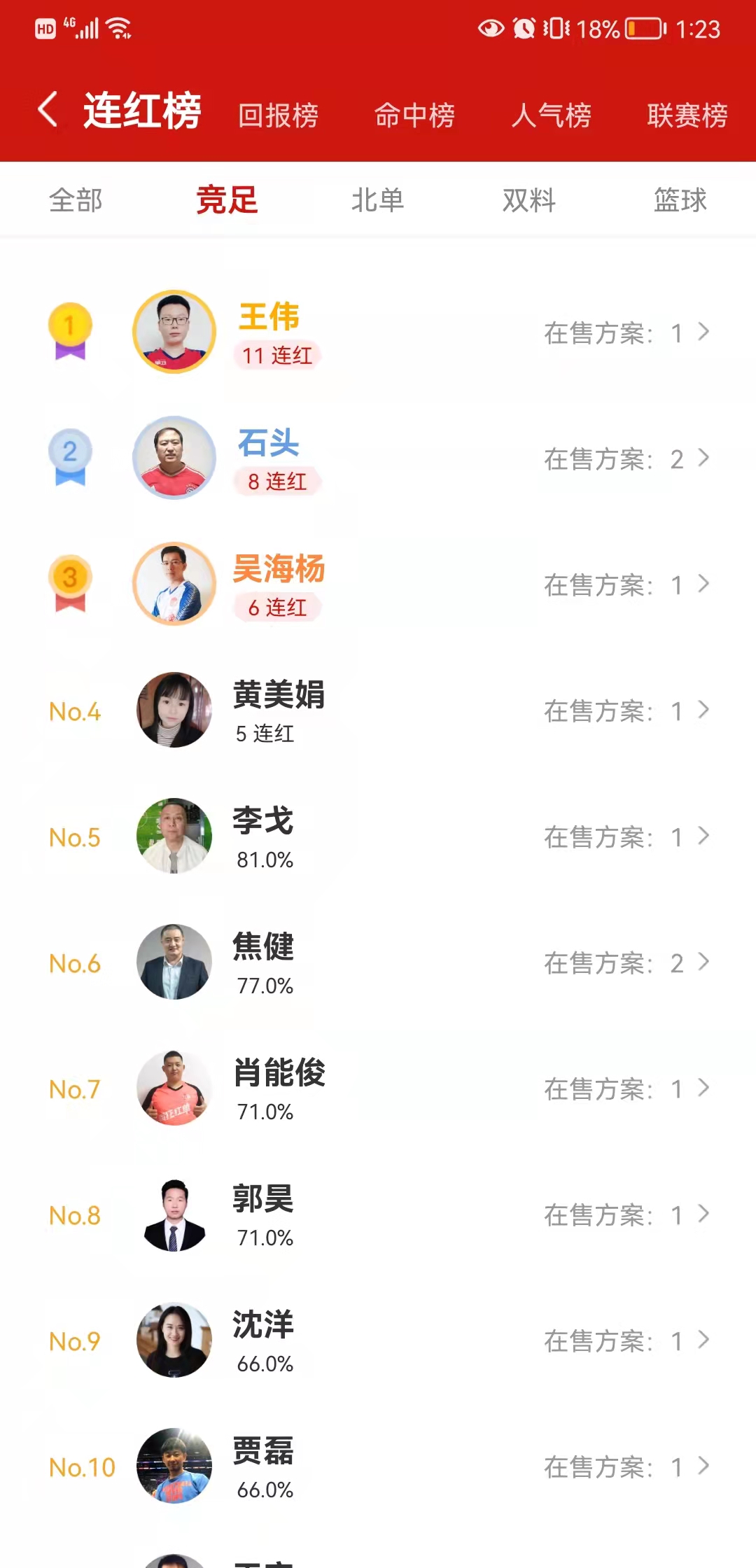 红单专家『吴海杨』近期状态火热,竞足推荐6连红稳健盈利!还有专家『王伟』竞足11连红,稳坐连红榜榜首,士气正盛!下面让我们来看看红单大神们的出色表现。