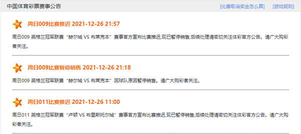 周日009 英格兰冠军联赛“赫尔城 VS 布莱克本”赛事官方宣布比赛推迟,现已暂停销售,后续处理请密切关注体彩官方公告。请广大购彩者关注。