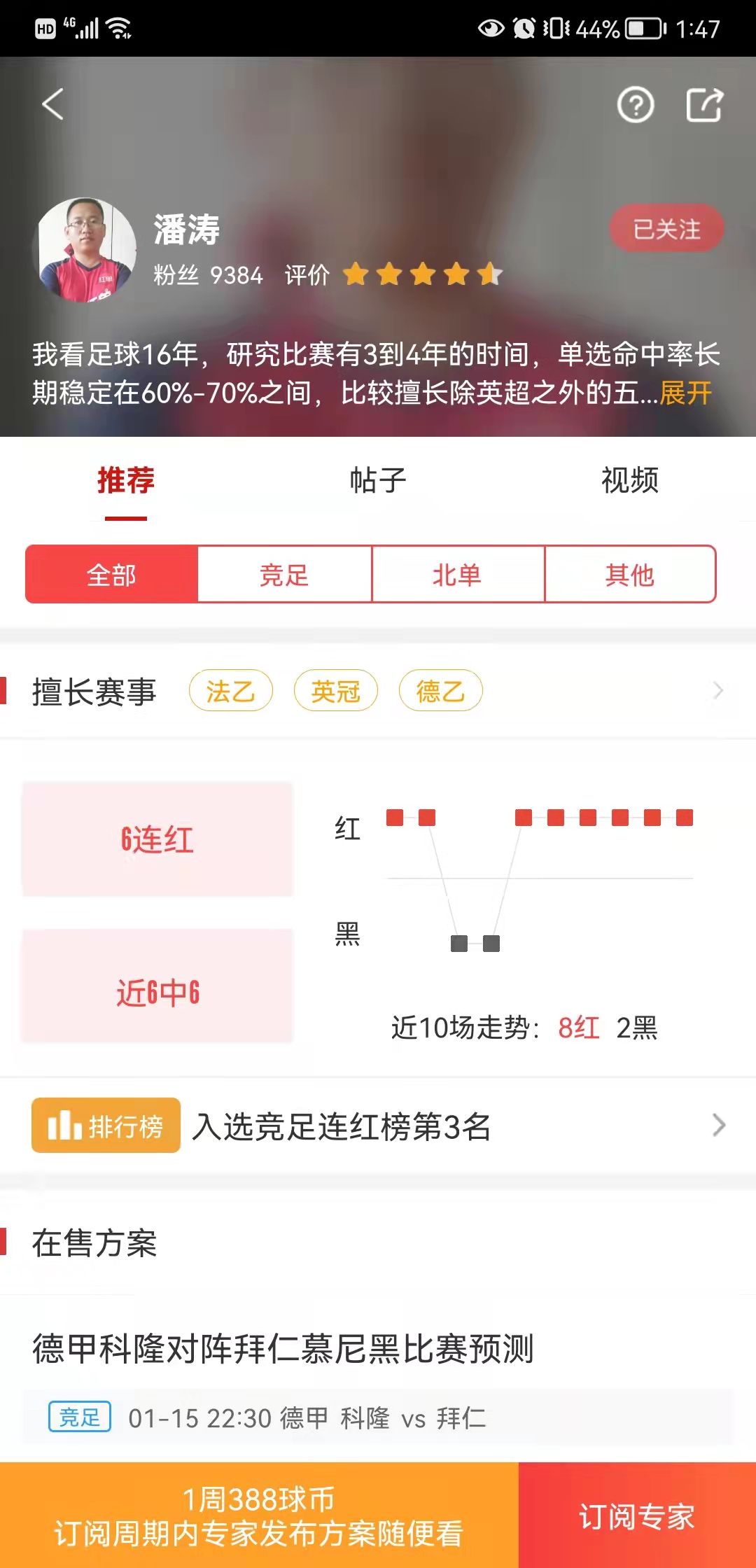 潘涛(点击进入主页)我看足球16年,研究比赛有3到4年的时间,单选命中率长期稳定在60%-70%之间,比较擅长除英超之外的五大联赛以及巴甲,荷甲,日职乙等小联赛。我最大的特点就是稳定。