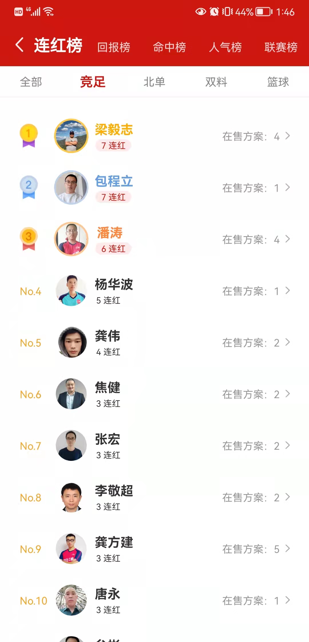 此外,昨日多位专家收获长连红走势,包程立7连红,杨华波5连红,龚伟4连红,焦健3连红,张宏3连红,龚方建3连红,李敬超3连红,唐永3连红!众多专家在线送胆!跟上就是赚到!速来红单一起盈利!