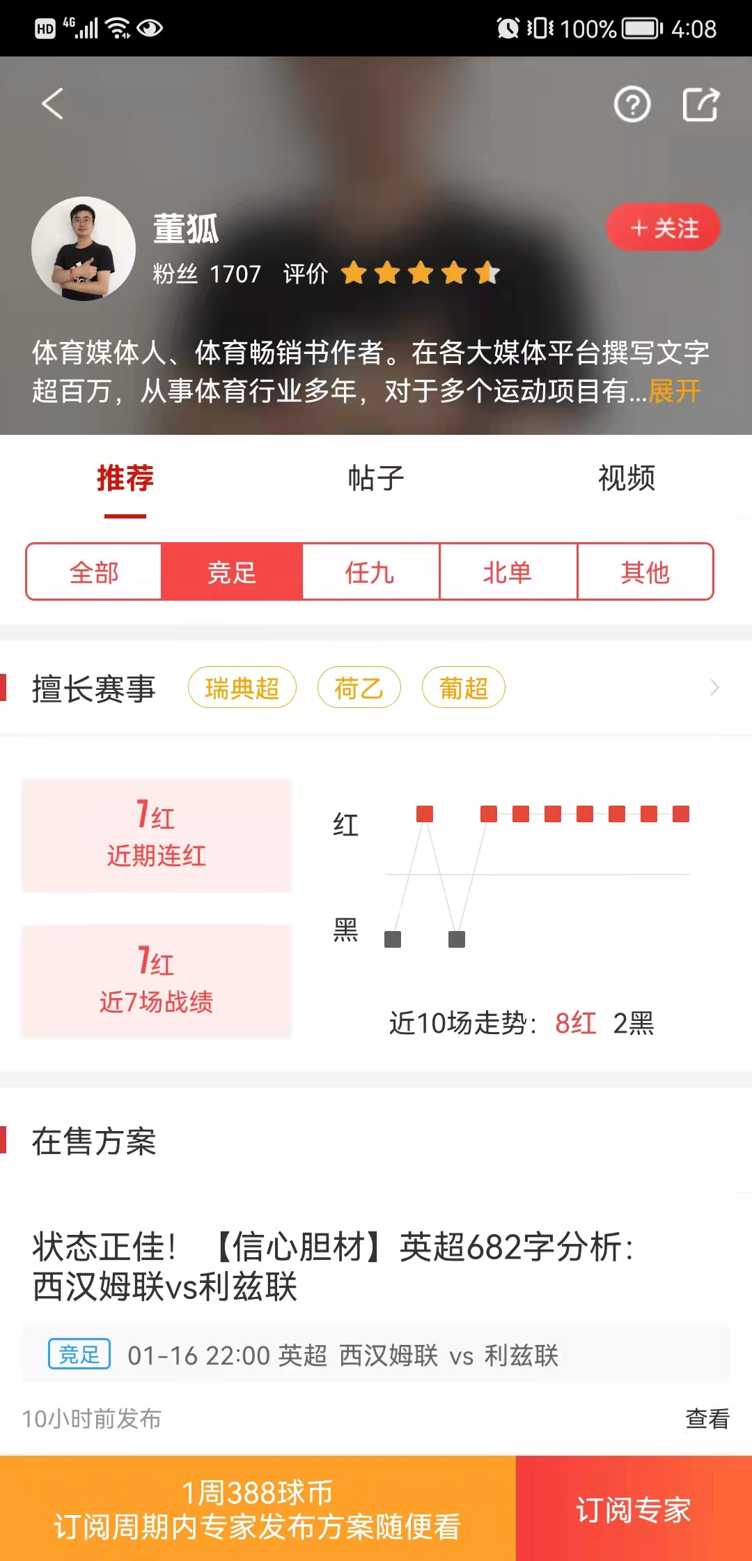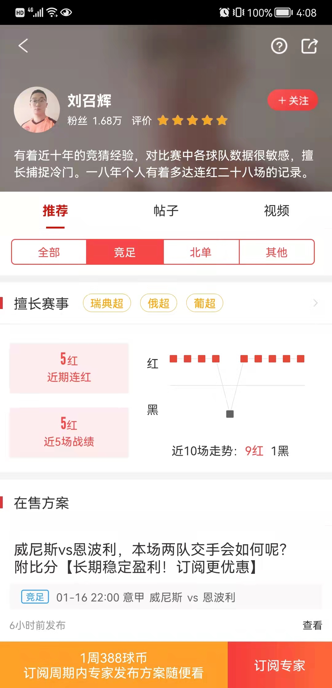 红单专家『刘召辉』昨日状态火热,竞足推荐5连红,士气正盛!还有专家『董狐』竞足7连红,稳坐榜首,有自己的独到之处!下面让我们来看看红单大神们的出色表现。