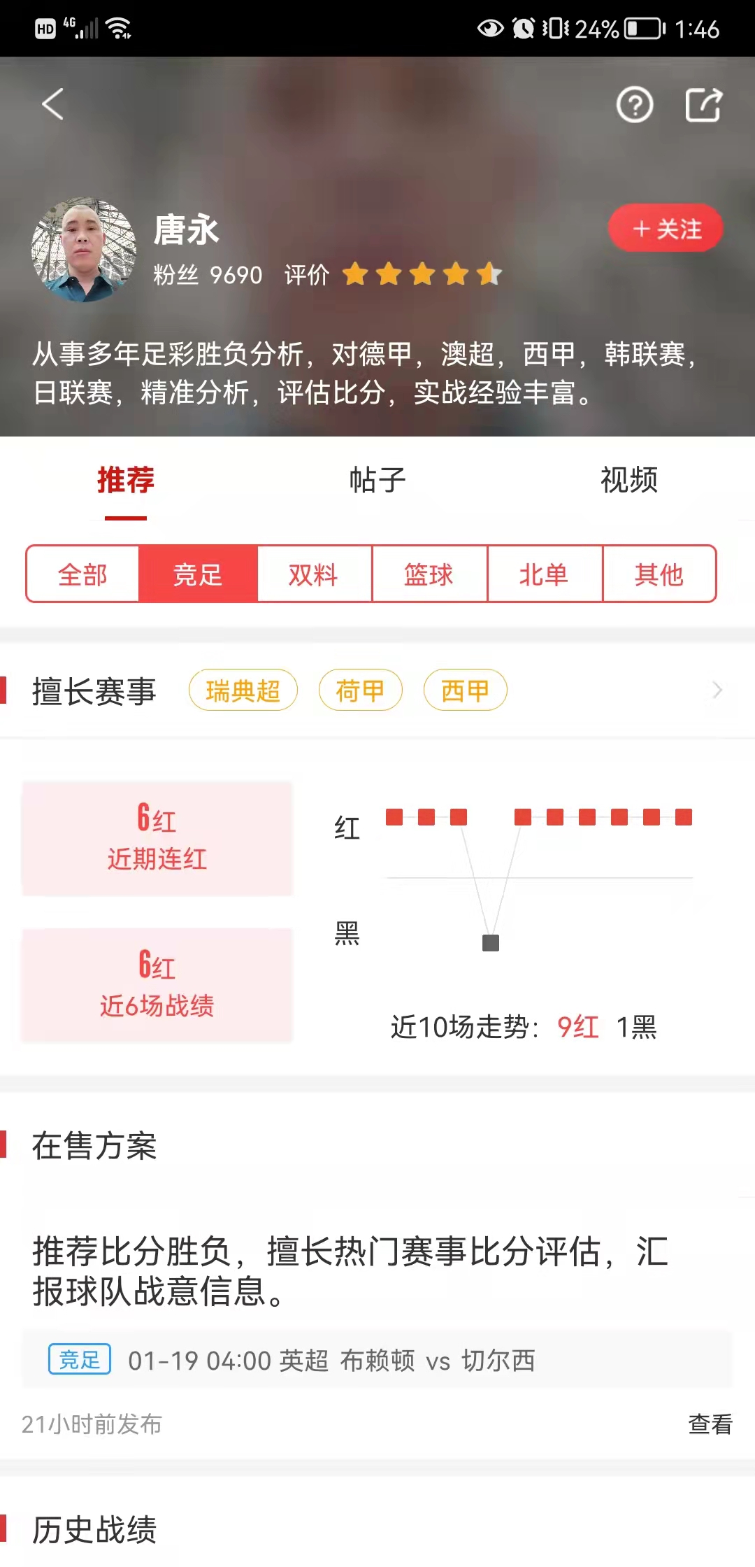 广大球迷朋友大家好,我是红单专家唐永,非常高兴和大家一起分享红单惊喜,近期状态火爆,目前竞足6连红,目前连续命中比分5场比分,昨天更是拿下AC米兰1:2的28倍暴击比分,近期10中9的状态,擅长比分评估,进球数分析,琢磨球队战意。