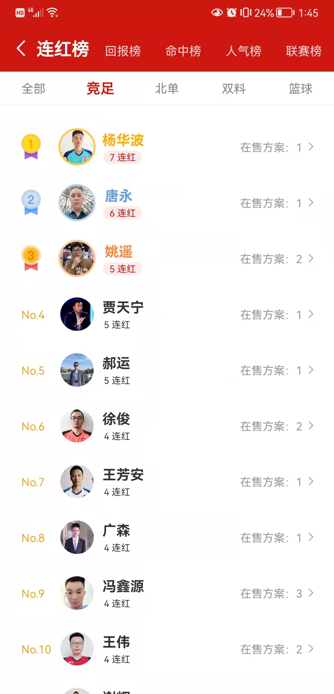 此外,昨日多位专家收获长连红走势,姚遥5连红,贾天宁5连红,郝运5连红,徐俊4连红,王芳安4连红,广森4连红,冯鑫源4连红,王伟4连红等!众多专家在线送胆!跟上就是赚到!速来红单一起盈利!