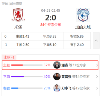 红单数据方面,有37%偏向了米堡让胜,有40%偏向了米堡小胜,其中专家潘鑫认为,米德尔斯堡有点属于欺软怕硬的队伍。本轮他们坐镇主场肯定力争全取三分,而且他们有冲级的可能。而加的夫城已经保级成功,不免会送上人情。最终也是成功命中。