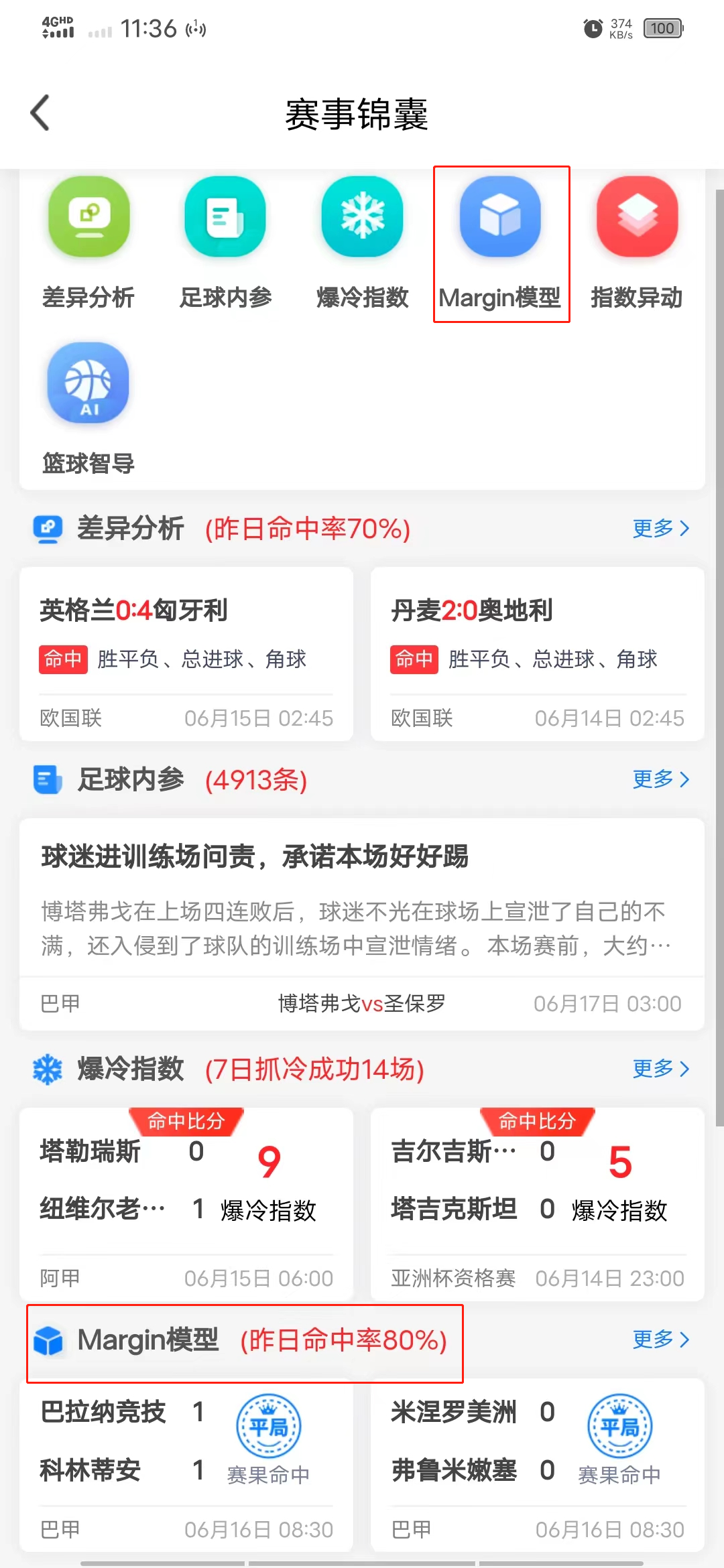 欢迎来到大数据的时代,红单致力于给用户,提供尽可能详细准确的队伍、指数分析,除了由各路专家大咖领衔的文字推荐内容之外,还创建了多种AI大数据模型,它是通过数据累积,整合出一套最适合本场比赛的玩法预测,例如胜平负、进球数等。只需要点进疯狂红单App,首页展示位中的赛事锦囊,方可查看多种分析模式。6月15日,Margin模型相关栏中,10场命中8场,命中率高达80%。