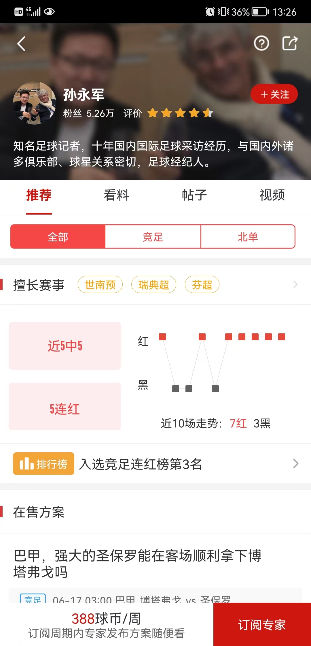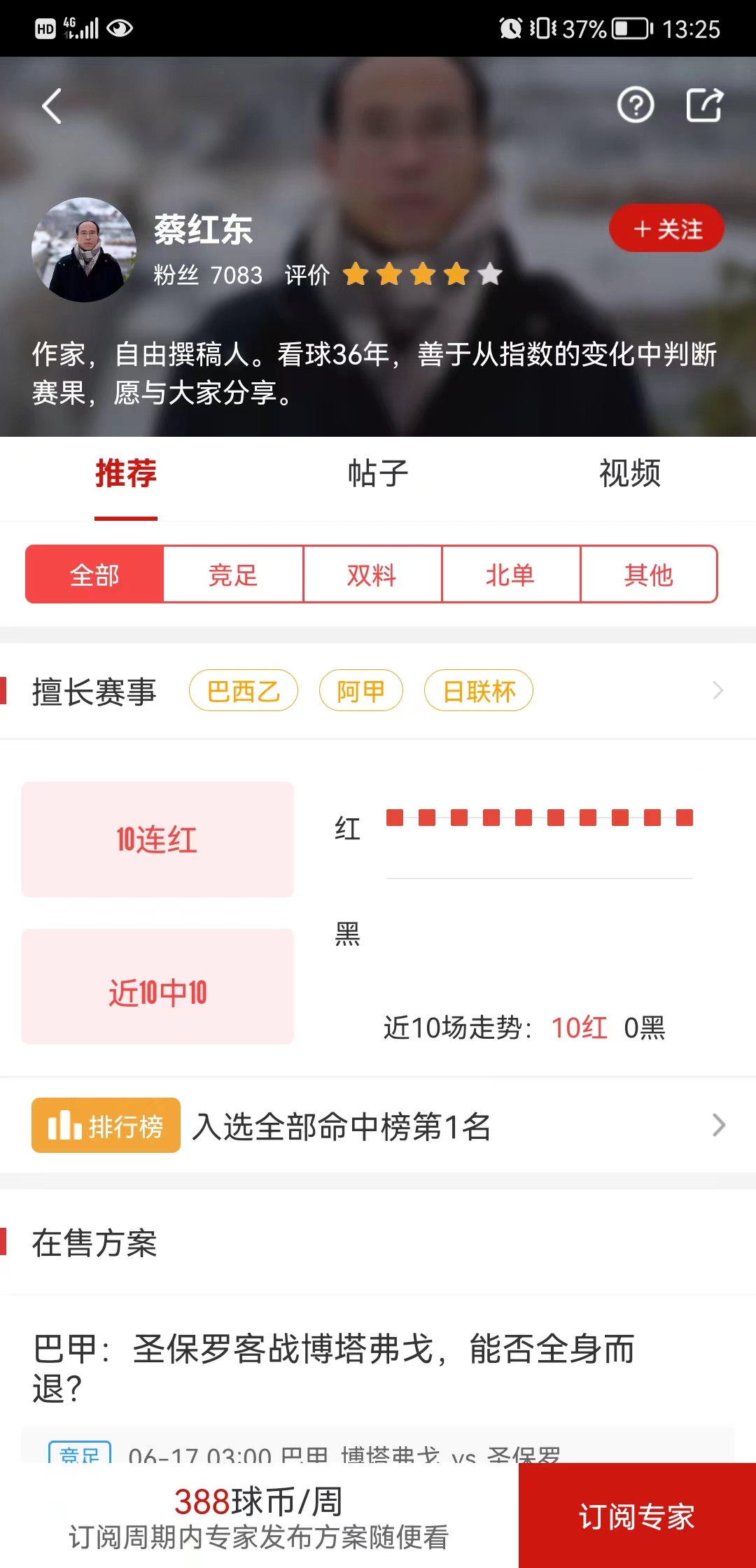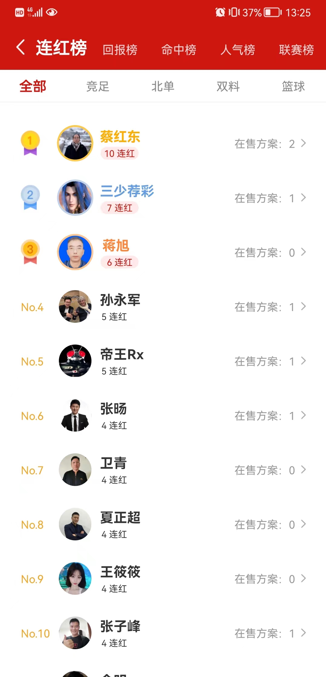 红单专家『蔡红东』近期状态火热,全部推荐喜迎10连红稳健盈利!还有名记『孙永军』收获5连红,同样士气不俗,值得信任。下面让我们来看看红单大神们的出色表现。