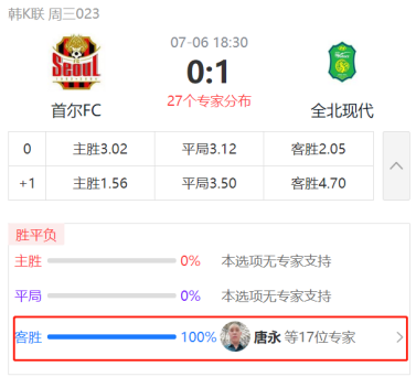 红单数据报告,有100%偏向了全北,其中专家唐永认为,首尔往绩对阵全北并不占优,而且目前主场连续遭遇3场不胜,整体状态不佳,数据分析对球队支持力度也不大。反观全北,实力更胜一筹,而且急需三分争冠,战意更加充足。