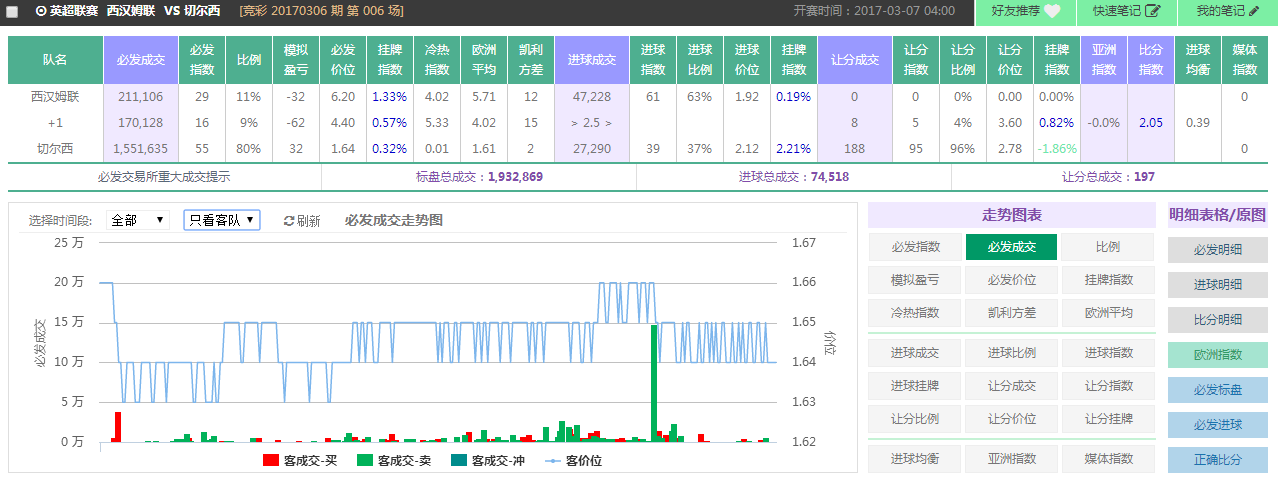 Spdex超级指数必发指数提示29-16-55早盘客胜明显领先。标盘成交量193万多临场可能突破1500万。Spdex超级指数提示早盘客胜出现一笔15万的卖单后,必发价位并没有上升而是在1.65至1.64间震荡。同时冷热指数和凯利方差都没有拉开。结合Spdex超级指数独家Q系统和早盘Spdex超级指数数据来看切尔西客战不乐观。