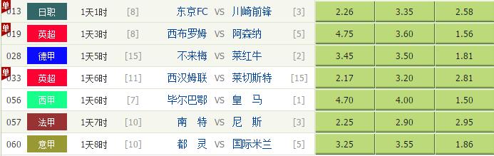 意甲、日职等赛事组成。俄日职第4轮东京FC坐镇主场迎战川崎前锋。川崎前锋在周中的亚冠杯客场挑战中超班霸广州恒大,球队凭借最后时刻的点球绝杀以1:1逼平对手,新赛季至今的各项赛事近六场取得两胜四平保持不败,不过球队的整体发挥并不突出,此番挑战近况神勇的FC东京,前景不容乐观。