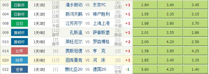 竞彩足球5月31日共有32场赛事受注,主要由日联杯、挪威杯、巴西杯、美职足等赛事组成。其中焦点赛亚冠江苏苏宁主场对战上海上港。江苏苏宁将在亚冠1/8次回合的比赛中回到南京的奥体中心对决上海上港。首回合1-2的比分,让上港占据了晋级的主动权,但1球小负也让苏宁并未完全失去机会,R-马上周中斩获赛季首球,加上特谢拉和拉米雷斯状态不错,苏宁南美三叉戟与上港巴西三叉戟胡尔克、埃尔克森以及奥斯卡的PK,将决定哪支球队能笑到最后。