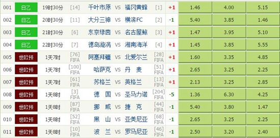 竞彩足球6月10日共有17场赛事受注,由日乙、世预赛、巴甲和美职赛事组成。即便轮休大部分主力,练兵意图明显,但德国依然稳坐小组头名宝座,而且目前已领先北爱尔兰5分的优势,出线前景一片光明。德国目前排名世界第三位,实力之强不言而喻,在首轮客场交手中面对圣马力诺就以制造8-0惨案,此役德国回到主场怕是一场屠杀将再次上演。