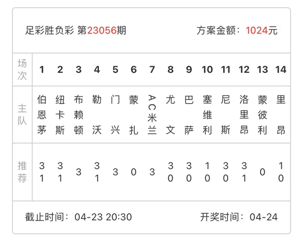 23056期胜负彩竞猜英超、英足总杯、德甲、意甲、西甲和法甲六项赛事,胜负彩.任九停售04/23 20:30,计奖04/24 11:00。随着周中三大欧战(欧冠/欧罗巴/欧协联)1/4赛次回合告一段落,无论晋级与否,都要回到联赛积极打拼,其中还有部分球队有国内杯赛进入到1/4赛以后的关键阶段,需要结合杯赛的赛制赛程评估球队联赛战意。下面由业主专家【星尔宇】为大家带来本期心水推荐,胜负彩22051期星尔宇团队命中一等奖1注、二等奖14注,共收获奖金410万(税前),胜负彩22064期团队再中一等奖,收获奖金32万多元,要上车的彩民请添加微信18303580288详询。
