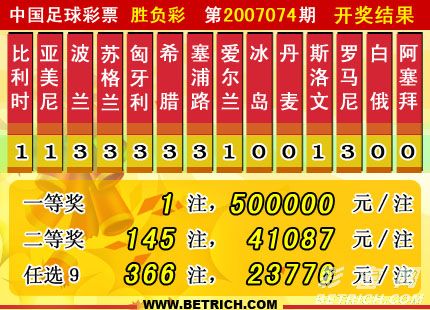 �����й������Ʊʤ���ʵ�07074�ڿ���������һ�Ƚ���1ע500�򣬶��Ƚ�145ע��ÿע41087Ԫ����������31029452Ԫ��ע�������ʽ��ۼƽ��8901194.5Ԫ����������ͷ�����ء���ѡ9������������һ�Ƚ�366ע��ÿע23776Ԫ����������13597220Ԫ��
