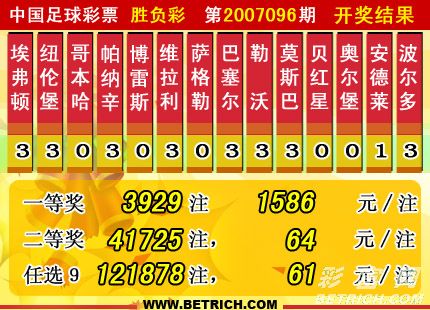 �����й������Ʊʤ���ʵ�07096�ڿ���������һ�Ƚ�3929ע��ÿע1586Ԫ�����Ƚ�41725ע��ÿע64 Ԫ����ѡ9����һ�Ƚ�121878 ע��ÿע61 Ԫ����������13914932 Ԫ��