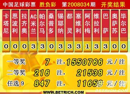 �����й������Ʊʤ���ʵ�08034�ڿ���������һ�Ƚ�7ע��ÿע����1550766Ԫ�����Ƚ�216ע��ÿע����21538Ԫ������ʤ�������۶�Ϊ24230722Ԫ����ѡ9������������һ�Ƚ�847ע��ÿע11659Ԫ��������ѡ�ų����۶�Ϊ15430022Ԫ��