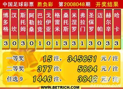 �����й������Ʊʤ���ʵ�08048�ڿ���������һ�Ƚ�15ע��ÿע����345651Ԫ�����Ƚ�377ע��ÿע5894Ԫ������ʤ����ȫ��������11573168Ԫ����ѡ�ų�����������һ�Ƚ�1446ע��ÿע3842Ԫ��������ѡ�ų�ȫ��������8680994Ԫ��
