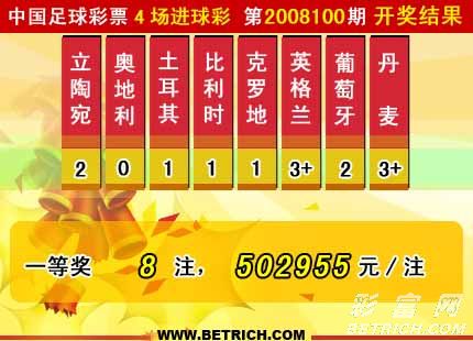 �����й������Ʊ4��������Ϸ��08100�ڿ���������һ�Ƚ�8ע��ÿע����502955Ԫ��ȫ����������4614964Ԫ�����ڹ���1070067.2Ԫ��