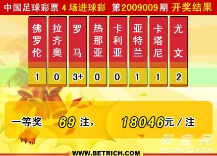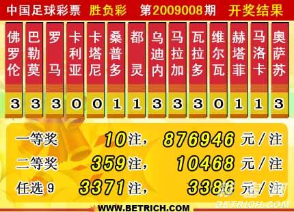 ����ʤ���ʵ�09008�ڿ���������һ�Ƚ�10ע��ÿע876946Ԫ�����Ƚ�359ע��ÿע10468Ԫ������ʤ����������Ϊ��19574696Ԫ����ѡ�ų�����������һ�Ƚ�3371ע��ÿע3386Ԫ��������ѡ�ų�������Ϊ��17837980Ԫ��