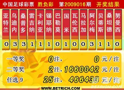 �����й������Ʊʤ���ʵ�09016�ڿ���������һ�Ƚ������У�7746865Ԫ��������ͷ�����������Ƚ�2ע��ÿע1660042Ԫ������ʤ����������Ϊ��17292110Ԫ����ѡ�ų�����������һ�Ƚ�25ע��ÿע466433Ԫ��������ѡ�ų�������Ϊ��18220042Ԫ��