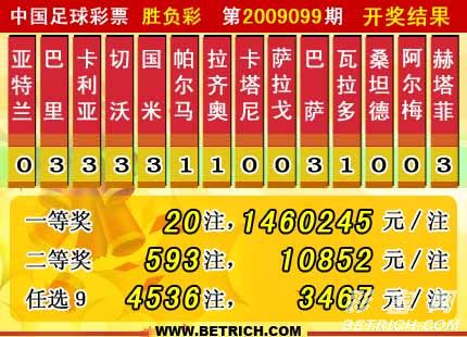 �����й������Ʊʤ����09099�ڿ���������һ�Ƚ�20ע��ÿע����1460245Ԫ�����Ƚ�593ע��ÿע10852Ԫ������ʤ���ʱ�����������33518282Ԫ������14188711.936Ԫ���뱾��ͷ�����ء���ѡ�ų�����������һ�Ƚ�4536ע��ÿע3467Ԫ��������ѡ�ų�ȫ����������24578140Ԫ��