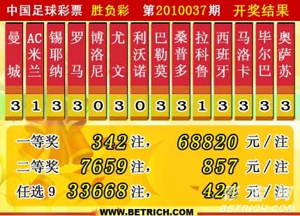 �����й������Ʊ��10037�ڿ���������һ�Ƚ�342ע��ÿע68820Ԫ�����Ƚ�7659ע��ÿע857Ԫ����������34200006Ԫ����ѡ9������������һ�Ƚ�33668ע��ÿע424Ԫ����������22353008Ԫ��