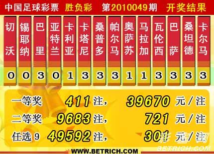 �����й������Ʊʤ����10049�ڿ���������һ�Ƚ�411ע��ÿע39670Ԫ�����Ƚ�9683ע��ÿע721Ԫ������ʤ����ȫ����������36393924Ԫ����ѡ9������������һ�Ƚ�49592ע��ÿע����301Ԫ��������ѡ�ų�ȫ����������23369902Ԫ��
