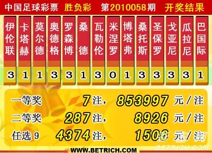 ����ʤ���ʵ�10058�ڿ���������һ�Ƚ�7ע��ÿע853997Ԫ�����Ƚ�287ע��ÿע8926Ԫ������ʤ����������13343710Ԫ����ѡ9������������һ�Ƚ�4374ע��ÿע 1506Ԫ�������ξ�������10296296Ԫ��
