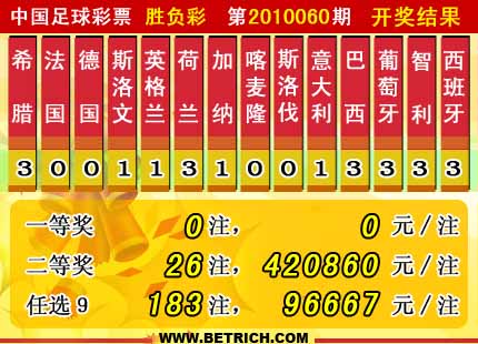 �����й������Ʊʤ���ʵ�10060�ڿ���������һ�Ƚ������У�25532216.19Ԫ���棬���Ƚ�26ע��ÿע420860Ԫ������ʤ����������56991554Ԫ�� ��ѡ�ų��淨��10060�ڿ�����ͷ���г�183ע��ÿע���� 96667Ԫ��������ѡ�ų�ȫ��������27640940Ԫ��
