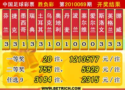 ����ʤ����10069�ڿ���������һ�Ƚ�20ע��ÿע����1213577Ԫ�����Ƚ�755ע��ÿע����5929Ԫ������ȫ��Ͷע�ܶ�Ϊ23318258Ԫ����ѡ9������������һ�Ƚ�3184ע��ÿע2315Ԫ����������11521848Ԫ��