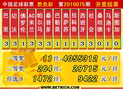 ����ʤ���ʵ�10075�ڿ���������һ�Ƚ��г�11ע��ÿע����4055312Ԫ�����Ƚ�264ע��ÿע����29715Ԫ������ȫ��Ͷע�ܶ�Ϊ40859162Ԫ��ʤ����10074��26303536���뱾��ͷ�����ء���ѡ�ų�����������һ��1472ע��ÿע����9422Ԫ������ȫ��Ͷע�ܶ�Ϊ21672470Ԫ��