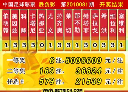 �����й������Ʊ��10081�ڿ���������һ�Ƚ�6ע��ÿע5000000Ԫ�����Ƚ�169ע��ÿע36824Ԫ����������32412914Ԫ��895092.48Ԫ���浽ʤ����10082��ͷ�����ء���ѡ9������������һ�Ƚ�579ע��ÿע21539Ԫ���������� 19486442Ԫ��