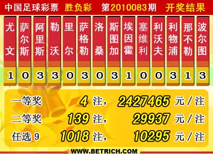 �����й������Ʊ��10083�ڿ���������һ�Ƚ�4ע��ÿע����2427465Ԫ�����Ƚ�139ע��ÿע����29937Ԫ������ʤ����������Ϊ21673796Ԫ��һ�Ƚ�1018ע��ÿע10295Ԫ��������ѡ9��ȫ����������Ϊ��16377028Ԫ��