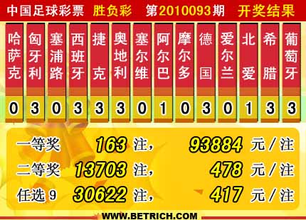 �����й������Ʊ��10093�ڿ���������һ�Ƚ�163ע��ÿע93884Ԫ�����Ƚ�13703ע��ÿע478Ԫ���������� 34158938Ԫ����ѡ9������������һ�Ƚ�30622ע��ÿע417Ԫ���������� 19958414Ԫ��