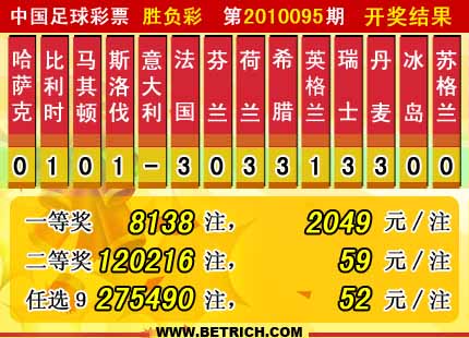 �����й������Ʊ��10095�ڿ���������һ�Ƚ�8138ע��ÿע2049Ԫ�����Ƚ�120216ע��ÿע59Ԫ����������37236234Ԫ����ѡ9������������һ�Ƚ�275490ע��ÿע52Ԫ����������22671504Ԫ��
