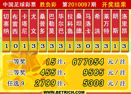 �����й������Ʊ��2010097�ڿ���������һ�Ƚ�15ע��ÿע677054Ԫ�����Ƚ�455ע��ÿע 9565Ԫ����������22669246Ԫ����ѡ9������������һ�Ƚ�2799ע��ÿע5303Ԫ����������23192970Ԫ��