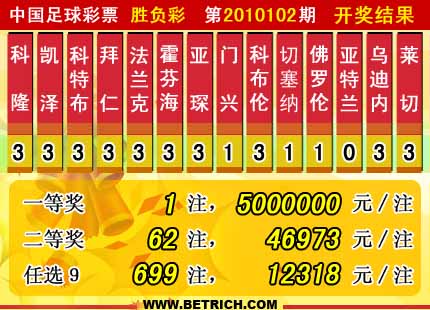 �����й������Ʊʤ���ʵ�10102�ڿ���������һ�Ƚ���1ע500��1795455.74Ԫ��������ͷ������(����Ӣ����ʤ����)�����Ƚ�62ע��ÿע����46973Ԫ������������15168428Ԫ����ѡ9��������һ�Ƚ�699ע��ÿע����12318Ԫ ��������ѡ9��ȫ��Ͷע�ܶ�Ϊ��13454422Ԫ��