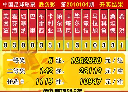 �����й������Ʊ��10104�ڿ���������һ�Ƚ�5ע��ÿע1862890Ԫ�����Ƚ�142ע��ÿע28112 Ԫ����������20791186Ԫ����ѡ9������������һ�Ƚ�1119ע��ÿע10947Ԫ���������� 19140900Ԫ��